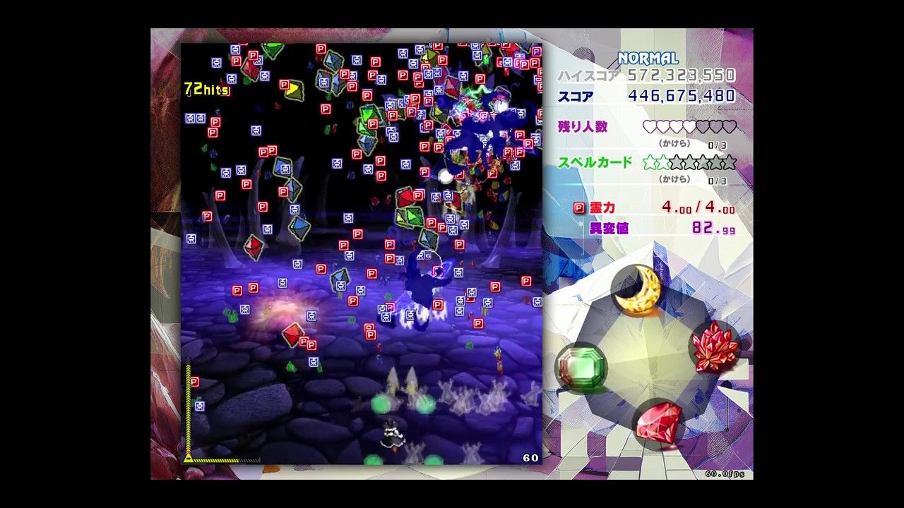 弾幕の軌道に沿って移動しつつ、間隔が空いたら抜けましょう。異変攻撃がたまったら、低速で上の弾幕密集地帯に突っ込み、高速で下がることで異変石のかけらを稼ぎます。