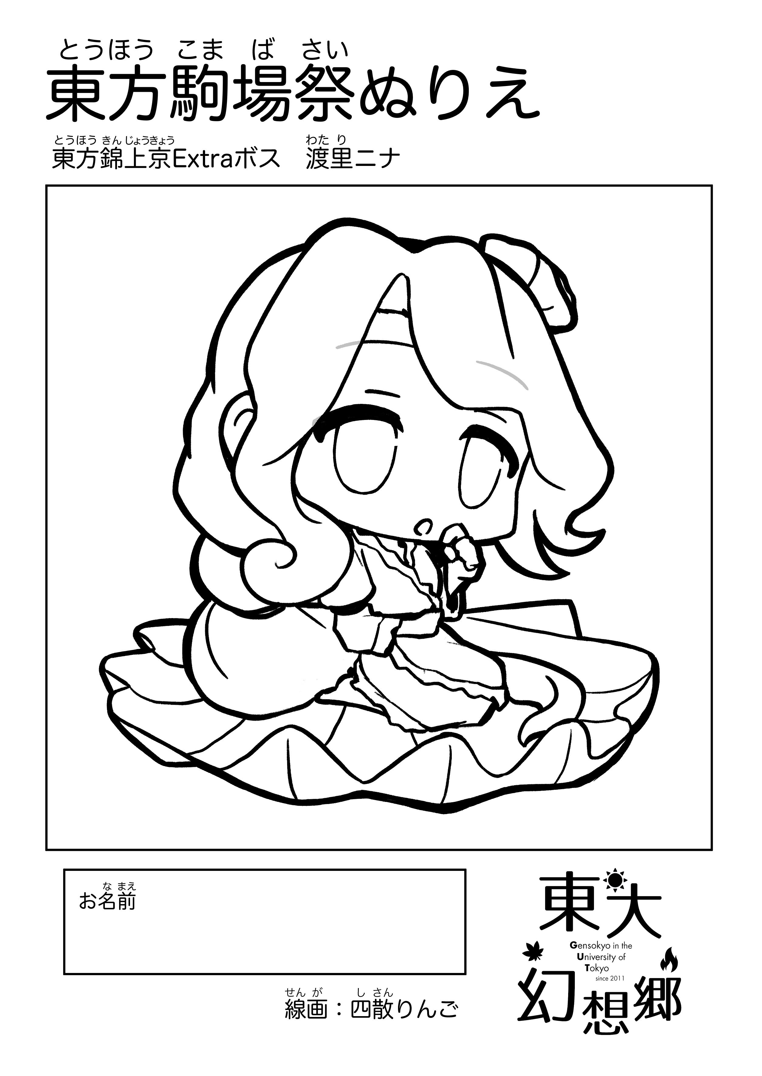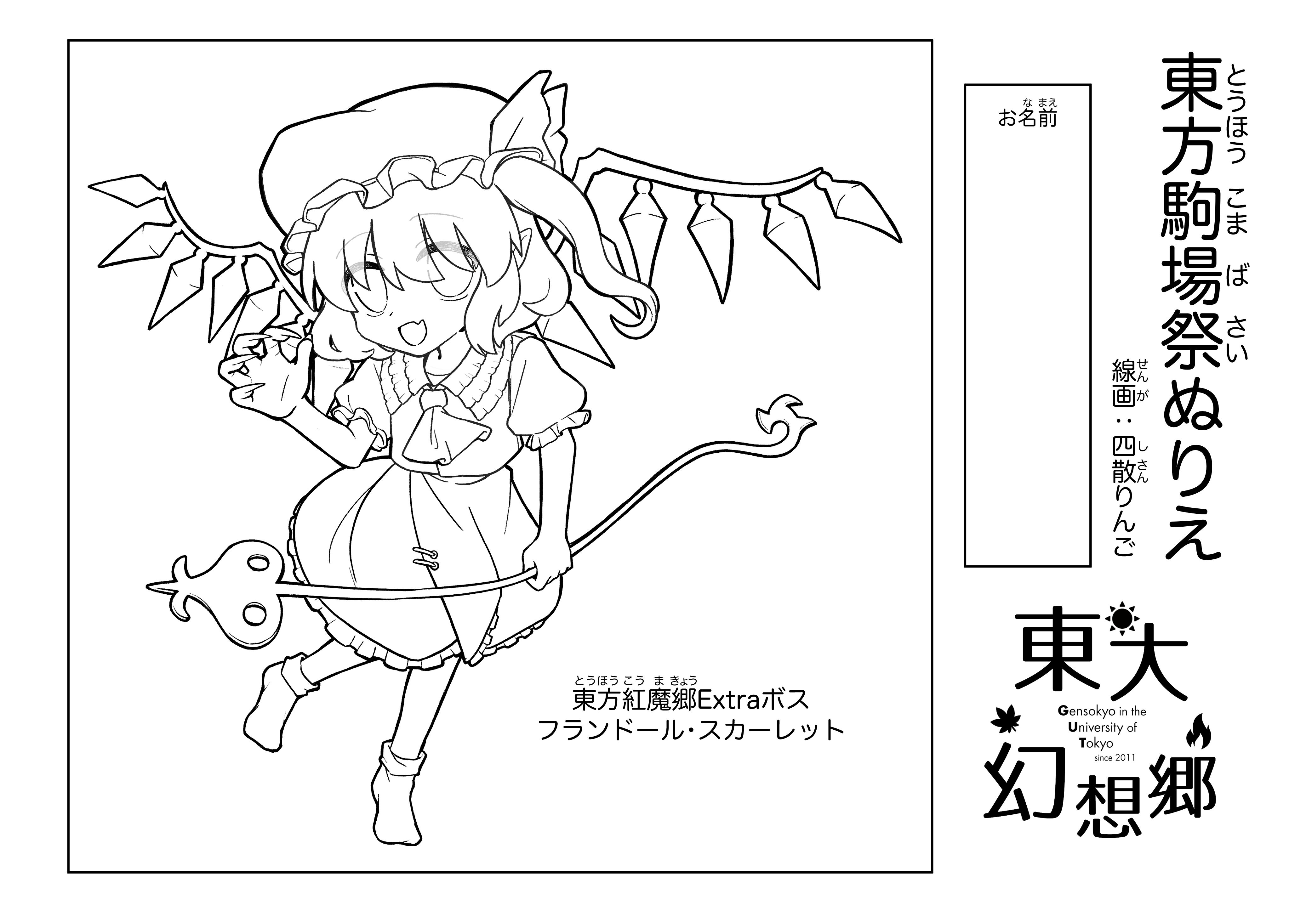 色変え・トリミングなどご自由に加工していただいて大丈夫ですので、気軽に塗ってください!必須ではないもののSNSに上げる場合は「#東方駒場祭塗り絵企画」というタグを付けてもらえると嬉しいです。
