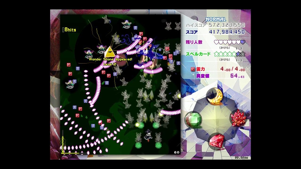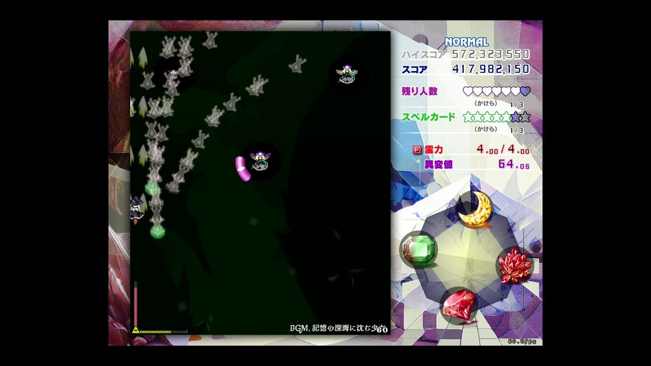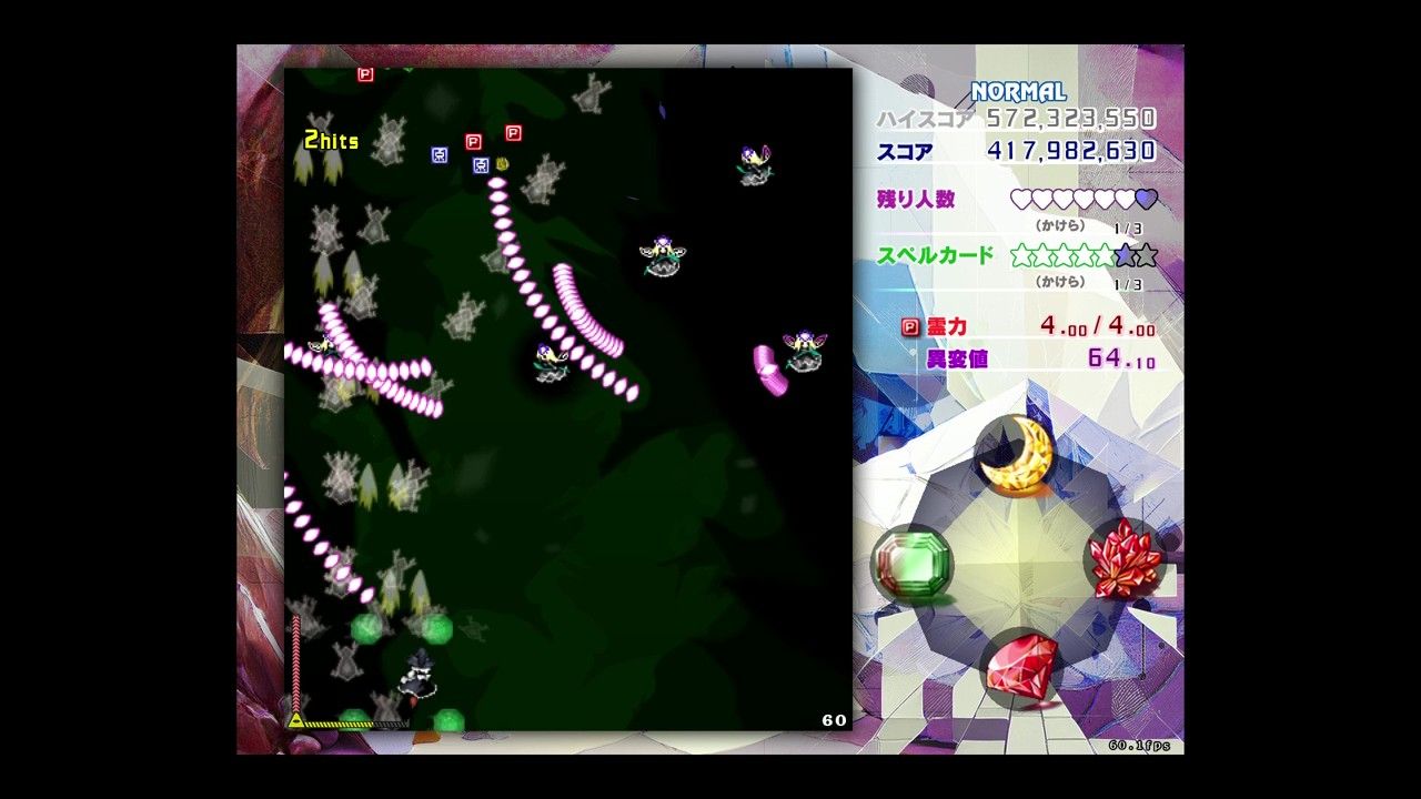 今作で重要になるのが異変敵です。倒すと盤面の弾を消してくれる上、ボム/残機のかけらを落としてくれます。異変敵は異変敵ゲージをMAXにすると出現します。ゲージのたまる条件は「「異変石のかけらを取得」「道中の敵を倒す(ヒット数が多いと効率UP)」「時間経過(ボス戦限定)」」(東方Project攻略Wiki)です。この異変敵をいかに多く倒すかでリソースの量が変わってきます。